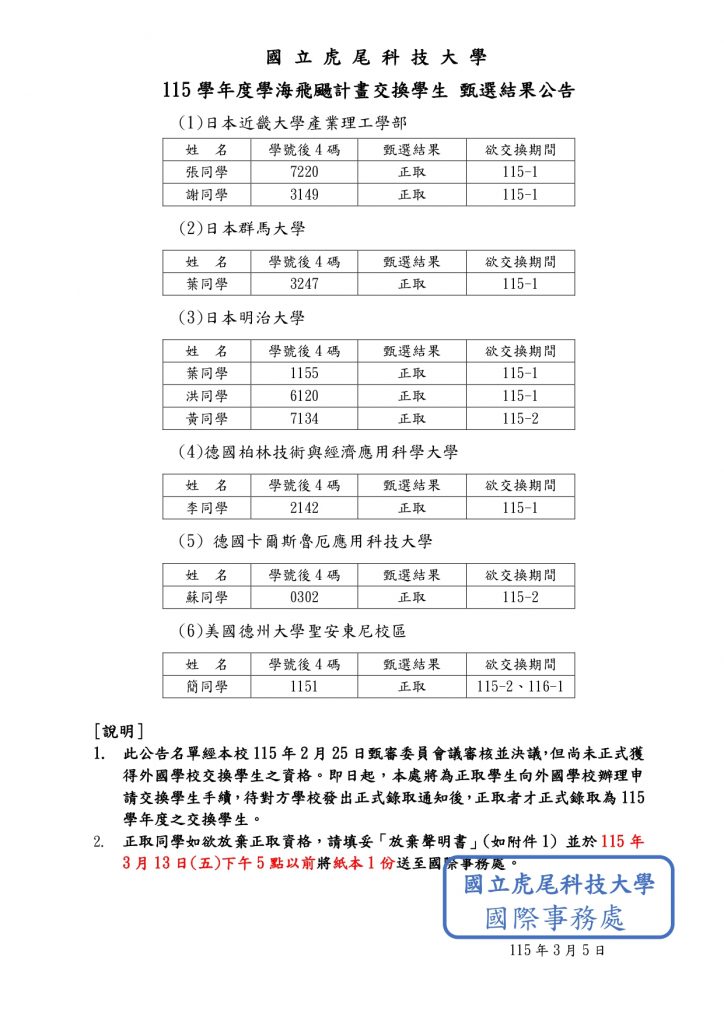 【校內公告】115學年度學海飛颺交換生 錄取公告