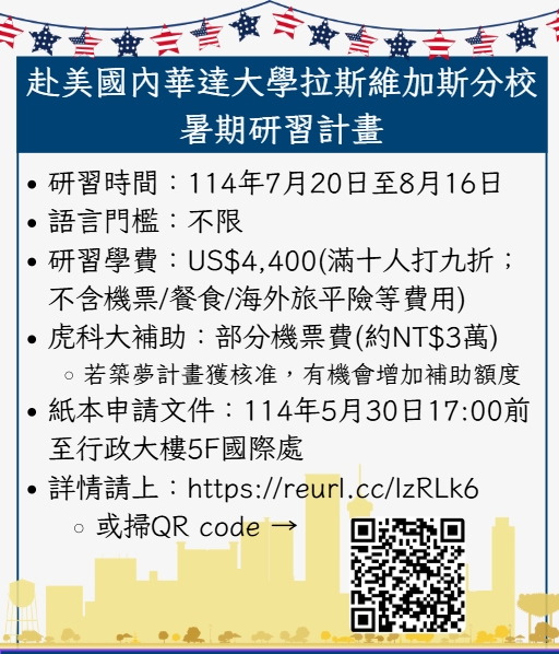 延長至114年5月30日))補助學生赴美國拉斯維加斯參與UNLV暑期研習計畫